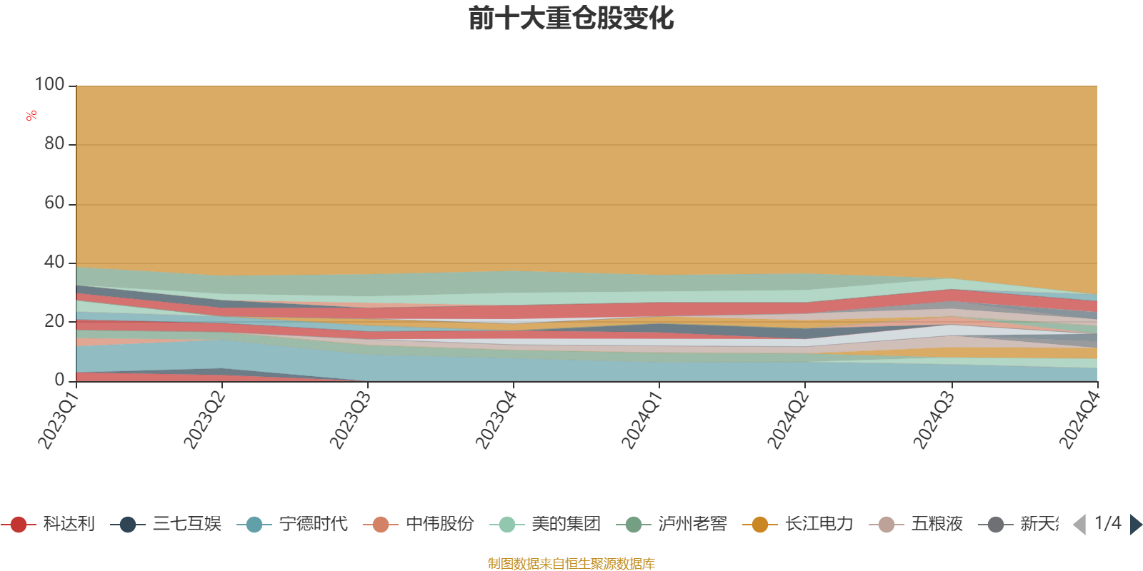 截至2024年四季度末,基金十大重仓股分别是宁德时代、立讯精密、长江电力、美的集团、双环传动、格力电器、盐津铺子、航发动力、新天然气、比亚迪。